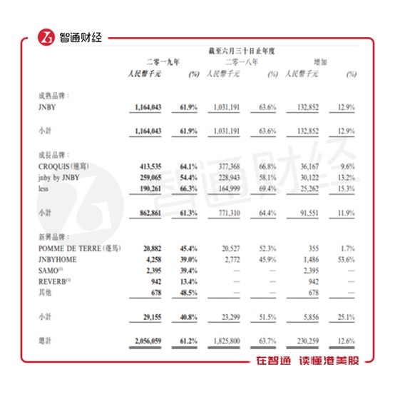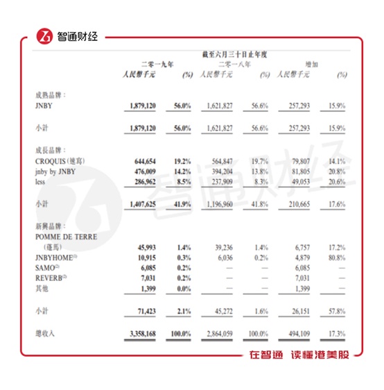 成熟、成长、新兴品牌营收全面增长背后,却是四年来最低的同比增长。智通财经APP了解到,江南布衣截止2019年6月的财年中,成熟品牌JNBY营收贡献达18.79亿元,同比增长15.9%,营收占比从去年同期的56.6%微降至56%。成长品牌中CROQUIS、jnby by JNBY、less营收分别同比增长14.1%、20.8%、20.6%至6.45亿元、4.76亿元以及2.87亿元,成长品牌整体营收同比增长17.6%至14.08亿元,营收占比从去年同期的41.8%微升至41.9%。新兴品牌7142万元营收贡献体量虽然最小,但是57.8%的同比增长最亮眼,营收占比提升0.5个百分点至2.1%。