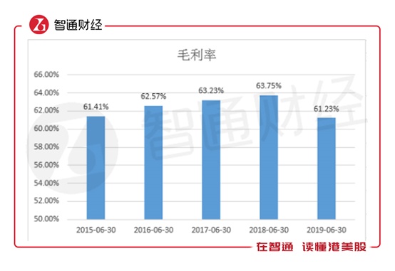 在过往的五个财年中,江南布衣的毛利率水平分别为61.41%、62.57%、63.23%、63.75%、61.23%,2019年财年61.23%的毛利率水平不仅是五年来最低的,而且同样是五年来首次出现的毛利率水平下滑。