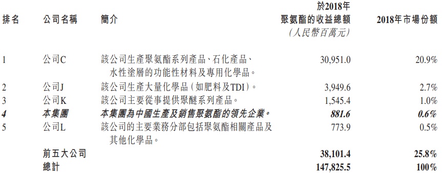 就2018年的收入数据来看,万华化学的聚氨酯收入309.5亿元,占全国市场20.9%,排名第一。GHW的聚氨酯收入虽然只有8.8亿元,占全国市场0.6%,不过在该行业也是位列第四的领先企业。