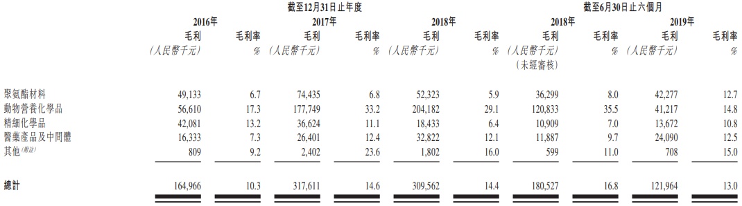 市占率高,自然也对应更高的盈利水平。根据智通财通APP了解,虽然GHW聚氨酯材料的收入占比最高,但是该业务毛利率只有5.9%,系各项业务中最低。毛利的主要贡献来自动物营养化学品,2018年毛利率29.1%,该业务毛利占总体毛利66%。