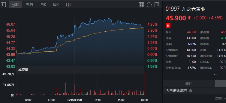 截至今日收盘,九龙仓置业涨4.56%,报45.9港元。