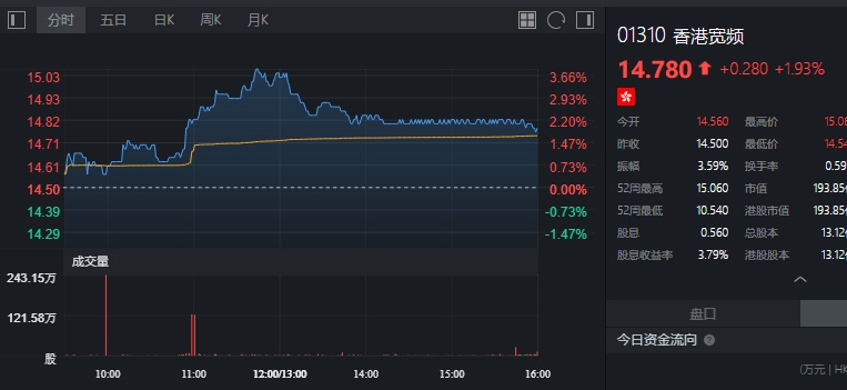 截至今日收盘,香港宽频涨1.93%,报14.78港元。