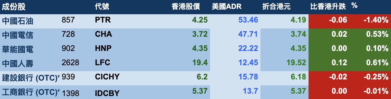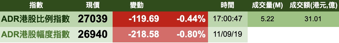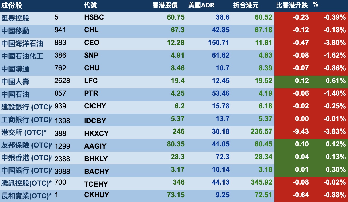 智通财经APP获悉,美股周三上涨,但港股ADR指数全日偏软。按比例计算,收报27039点,跌119.69点。大型蓝筹股微跌,汇丰控股(00005)收报60.52元,较港收市跌0.23元;腾讯控股(00700)收报345.92元,较港收市跌0.08元。