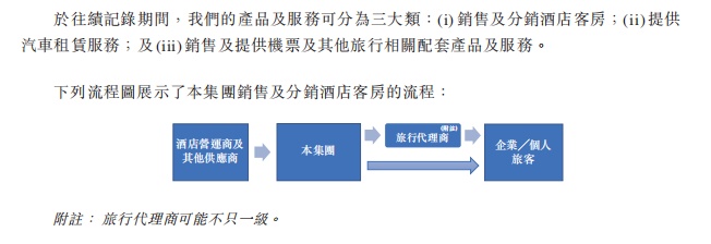瀛海的产品及服务可分为三大类:销售及分销酒店客房,提供汽车租赁服务,销售及提供机票及其他旅行相关配套产品及服务。