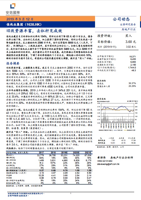 智通财经APP获悉,9月12日,安信国际发布研究报告称佳兆业集团(01638)在去杠杆上进展顺利,加上在深圳及大湾区主要城市的旧改资源将为公司带来优质土储,因此看好公司中长远发展,并上调评级至“买入”,目标价3.60港元。
