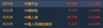 智通财经APP获悉,内险股午后随A股集体上扬。中国平安(02318)A股收涨3.1%,创历史新高,H股跟涨。截至15时05分,中国平安涨1.71%,报价94.9港元,中国财险(02328)涨1.6%,中国人寿(02628)涨1.55%。