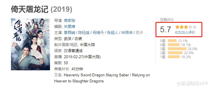 《倚天屠龙记》作为金庸的经典作品,一直拥有大量粉丝的簇拥。虽然新版《倚天屠龙记》有曾舜晞、陈钰琪、祝绪丹等年轻明星助阵,但上映之后却引来了大量的吐槽,一部充满江湖气息的武侠剧变成青春言情偶像剧。豆瓣6.25万人评论,40.8%的人给予3星以下评价,总评分5.7分,连人民网也忍不住全方位的点名批评:武侠剧为何越拍越没灵魂。