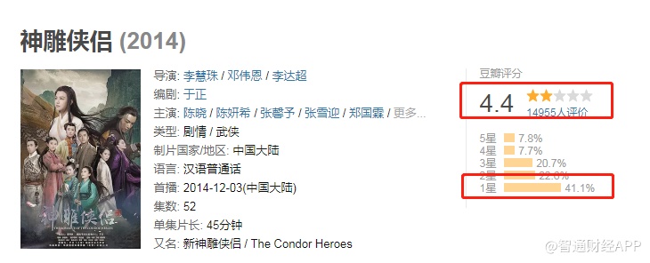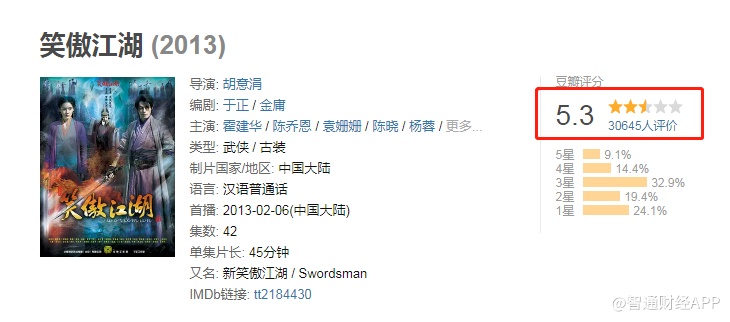 但实际上,华夏视听传媒翻拍作品的口碑并不好。除了上述的《倚天屠龙记》,华夏视听传媒2014年上映的《神雕侠侣》豆瓣评分仅4.4分,41.1%的观众给一星评价;2013年上映的《笑傲江湖》豆瓣评分仅为5.3%,43.5%的观众给予3星以下评价。