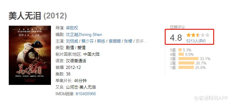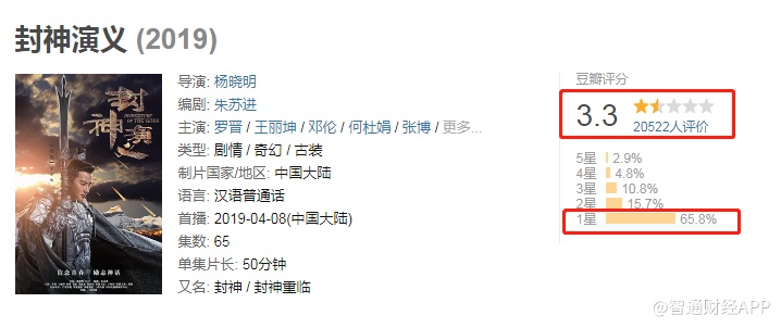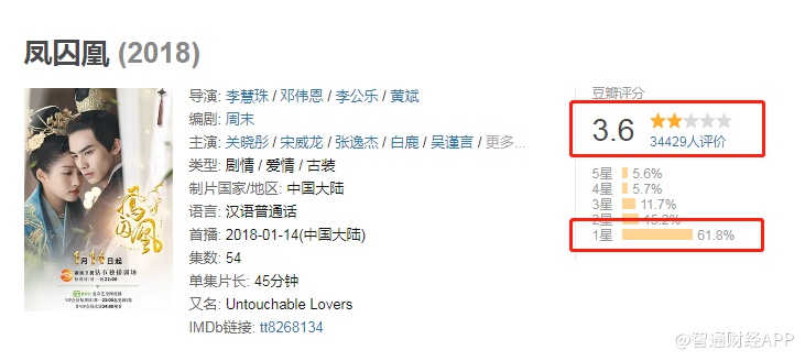 据智通财经APP了解,除了翻拍金庸作品,华夏视听传媒近年来还制作了《凤求凰》、《封神》、《美人无泪山河恋》等作品,但依旧逃不过低分和吐槽。《凤求凰》豆瓣评分仅3.6分,61.8%的观众给予一星评价;《封神》豆瓣评分仅3.3分,65.8%的观众给予一星评价;《美人无泪山河恋》豆瓣评分仅4.8分,52.6%的观众给予三星以下评价。