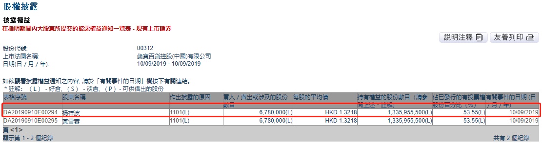 智通财经APP获悉,联交所最新资料显示,9月10日,联席主席杨祥波增持岁宝百货(00312)678万股,每股作价1.3218港元,总金额约为896.18万港元。增持后最新持股数目约为13.36亿股,最新持股比例为53.55%。