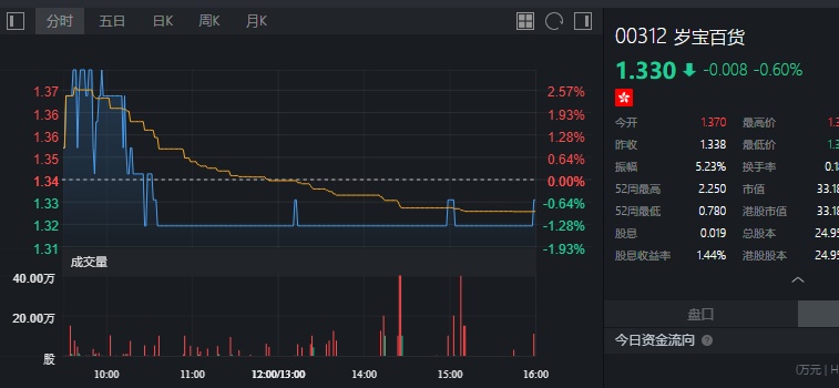 截至今日收盘,岁宝百货跌0.6%,报1.33港元。