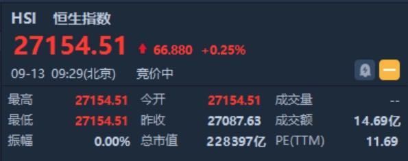 智通财经APP获悉,恒生指数开盘高开66.88点或0.25%,报27154.51点。国企指数涨0.28%,报10621.52点。红筹指数涨0.19%,报4288.08点。大市盘前成交14.69亿港元。