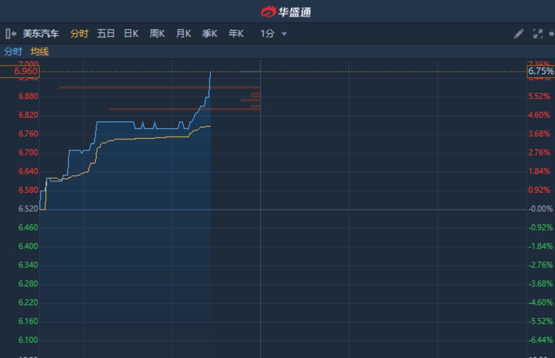 智通财经APP获悉,贵阳成国内首个取消购车摇号的城市,汽车经销商全线大涨,美东汽车(01268)股价快速攀升,高见7港元,创历史新高。截至11时25分,涨6.75%,报价6.96港元,成交额478.8万。
