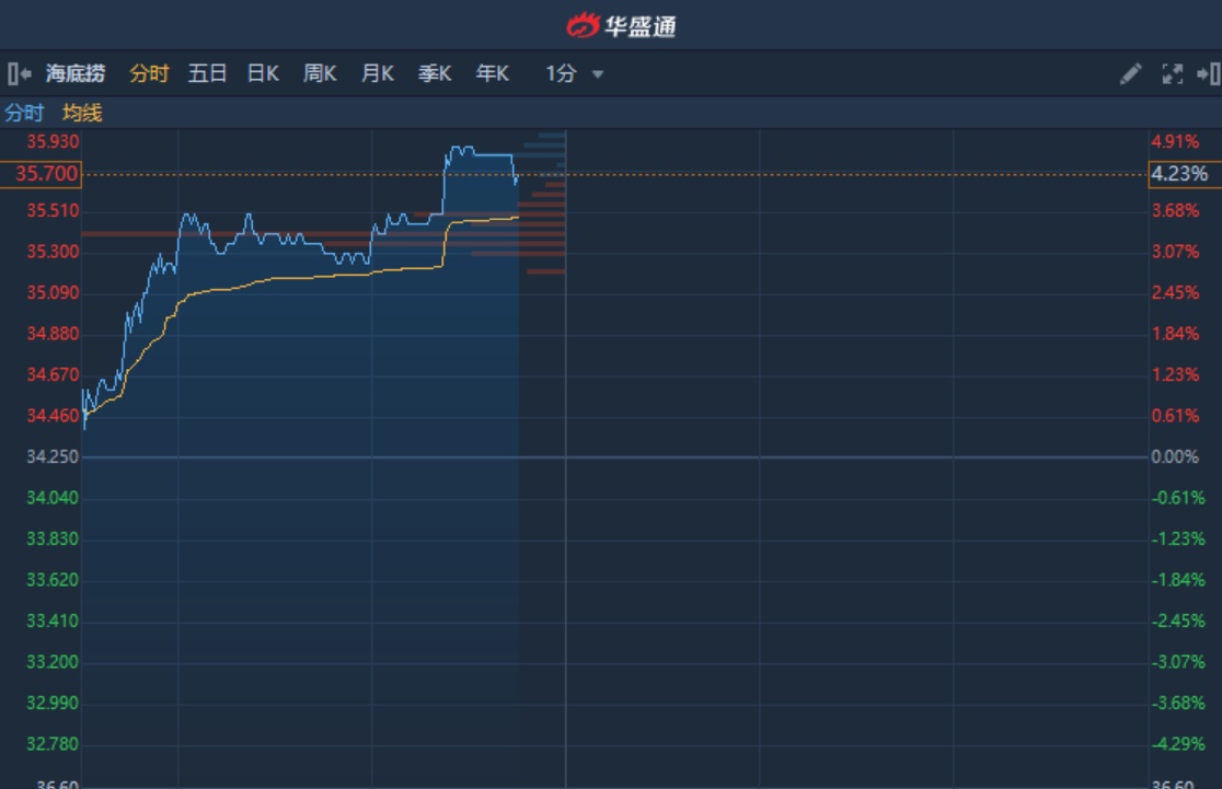 智通财经APP获悉,海底捞(06862)股价止跌反弹,突破所有均线。截至11时44分,涨4.23%,报价35.7港元,成交额5849万。