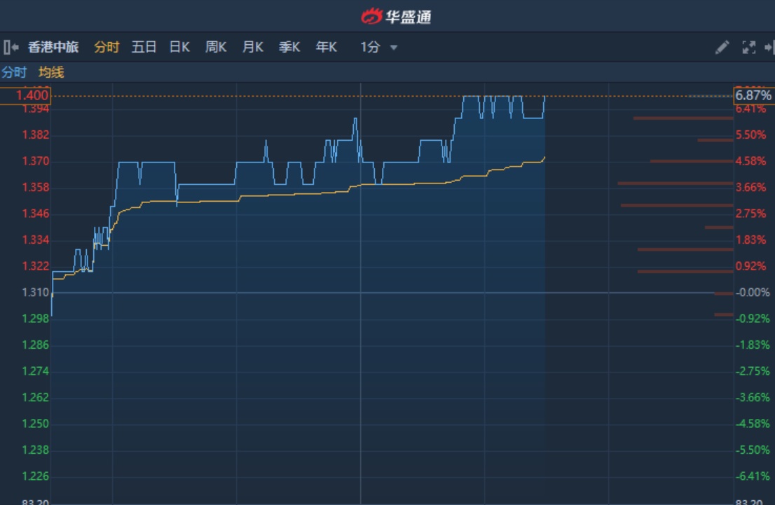 智通财经APP获悉,香港中旅(00308)今日股价持续攀升,截至14时28分,涨6.11%,报价1.39港元,成交额1300万。
