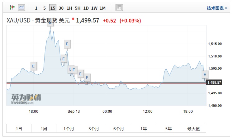 截止发稿,现货黄金短线跳水跌破1500美元/盎司,报1499.57美元/盎司