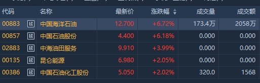截至发稿,中海油(00883)涨8.74%,报12.94港元;中石油(00857)涨7.38%,报4.45港元;中海油服(02883)涨4.93%,报10港元;中石化(00386)涨3.43%,报5.12港元。
