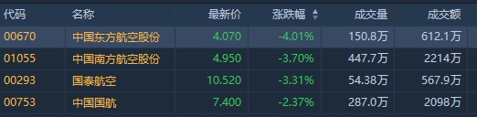 截至发稿,东方航空(00670)跌4.01%,报4.07港元;南方航空(01055)跌3.68%,报10.48港元;国泰航空(00293)跌3.49%,报10.5港元;中国国航(00753)跌2.64%,报7.38港元。