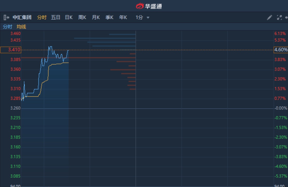 智通财经APP获悉,近期,中汇集团(00382)发盈喜,预期年度综合盈利同比显著增加,消息刺激股价连续破顶,今日盘中高见3.44港元,再创上市新高。截至10时30分,涨4.6%,报价3.41港元,成交额1199万。