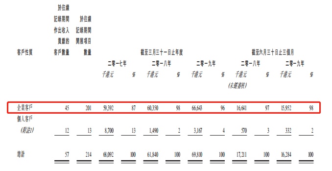 于过往业绩记录期间,公司主要受企业客户委聘提供室内设计服务,截至2019年3月31日止三个年度各年及截至2019年6月30日止三个月,分别占总收入的约87%、98%、96%及98%。其余的13%、2%、4%及2%的总收入来自于个人客户。