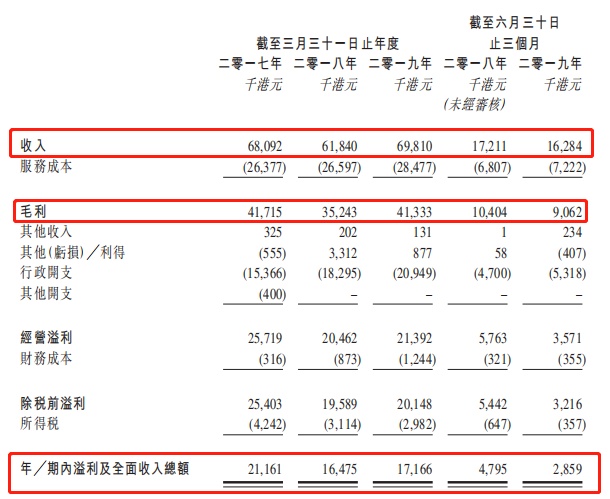 截至2019年3月31日止三个年度以及截至2018年及2019年6月30日止三个月,公司的收入分别约为港元6810万、6180万、6980万、1720万以及1630万;毛利润分别为港元4170万、3520万、4130万及910万。