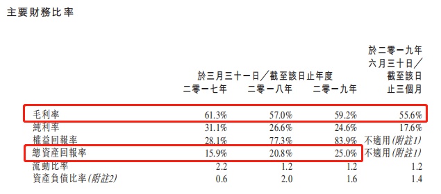 截至2019年3月31日,公司的毛利率为59.2%,同比增长2.2个百分点;总资产回报率为25%,同比增长4.2个百分点。其它主要财务比率如下: