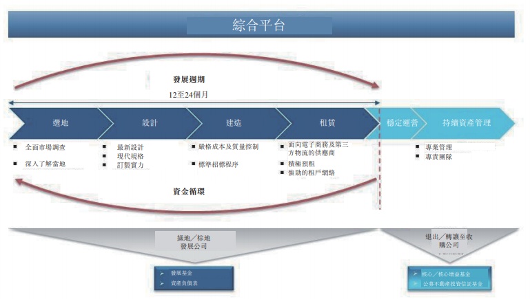 业务模式:ESR凭藉自身的实力物色、设计、建设、租赁及管理投资组合资产。利用自有资金以及横跨各级别风险与流动性等级的汇集资金及投资公司来扩大其业务规模。亦在有发展前景的市场,以自有资产负债表收购私募及公开平台以迅速扩大业务规模。