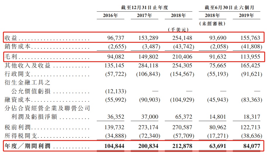 主要财务数据:根据公司最新上传的上市申请文件显示,截至2019年6月30日止六个月,公司取得收益1.56亿美元,母公司拥有人应占溢利为7595万美元,按年增加22.91%;而经调整纯利录得939.1万美元,按年骤减76.45%。