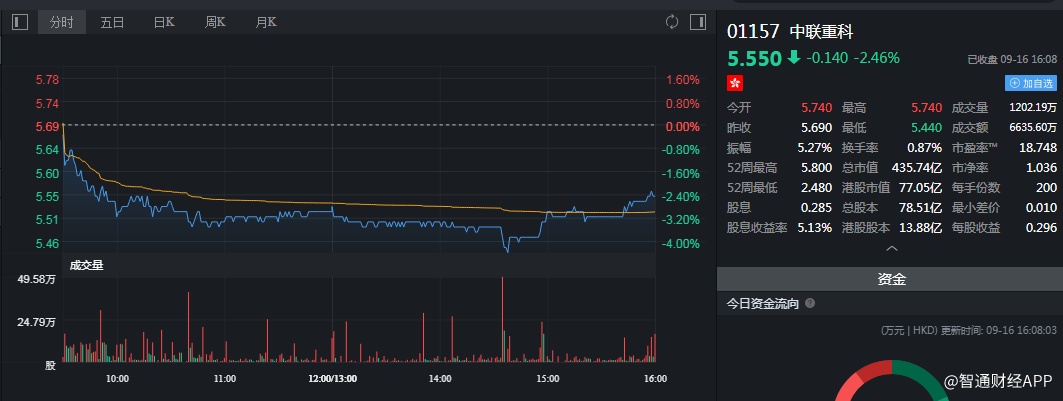 截至今日收盘,中联重科跌2.46%,报5.55港元。