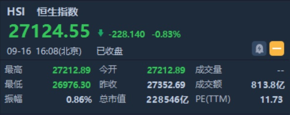 智通财经APP获悉,恒指早盘低开139.8点或0.51%,报27212.89点。截至收盘,恒生指数跌228.14点或0.83%,报27124.55点,全日成交额达813.81亿。国企指数跌0.56%,报10628.25点,红筹指数涨0.53%,报4334.72点。
