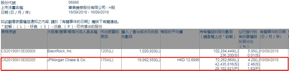 智通财经APP获悉,联交所最新资料显示,9月10日,摩根大通减持华泰证券(06886)1999.255万股,每股作价12.6995港元,总金额约为2.54亿港元。减持后最新持股数目为7226.2668万股,最新持股比例为4.2%。