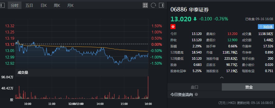 截至今日收盘,华泰证券跌0.76%,报13.02港元。