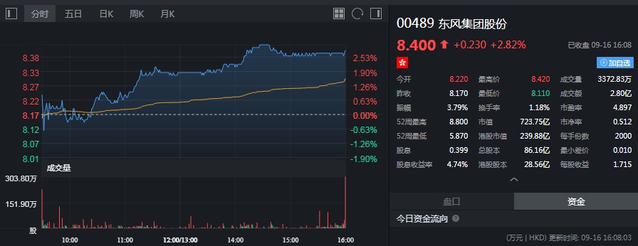 截至今日收盘,东风涨2.82%,报8.40港元。