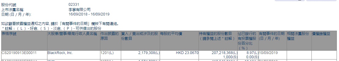 智通财经APP获悉,联交所最新资料显示,9月10日,贝莱德减持李宁(02331)217.93万股,每股作价23.06港元,总金额约为5025.46万港元。减持后最新持股数目约为2.07亿股,最新持股比例为8.97%。