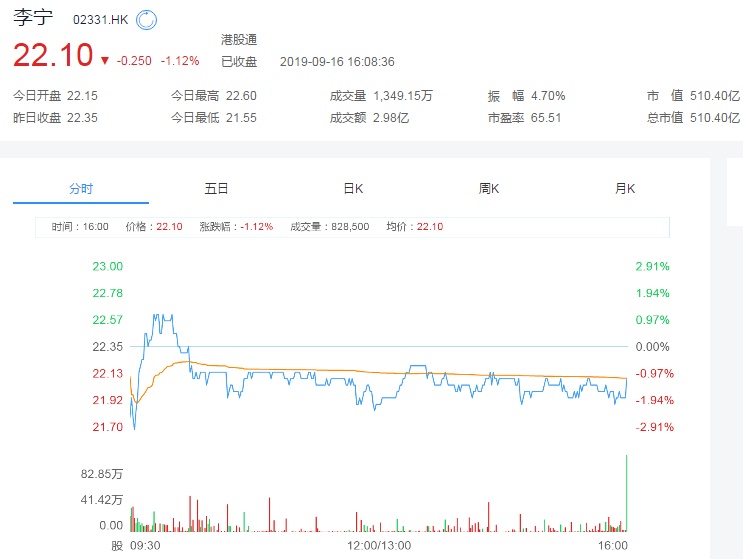 截至今日收盘,李宁(02331)跌1.12%,报22.1港元。