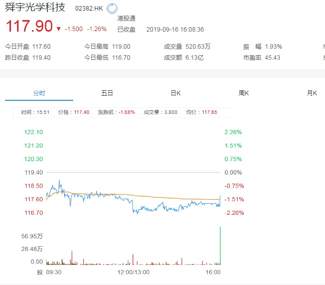 截至今日收盘,舜宇光学(02382)跌1.26%,报117.9港元。
