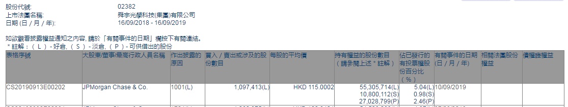 智通财经APP获悉,联交所最新资料显示,9月10日,摩根大通增持舜宇光学(02382)109.74万股,每股作价115港元,总金额约为1.26亿港元。增持后最新持股数目约为5530.57万股,最新持股比例为5.04%。