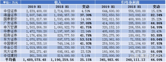2019年上半年,收入、归母净利润排名前三位分别为中信证券、海通证券、国泰君安三家券商,中信证券上半年收入达283.9亿元人民币,实现归母净利润约64.5亿元人民币。