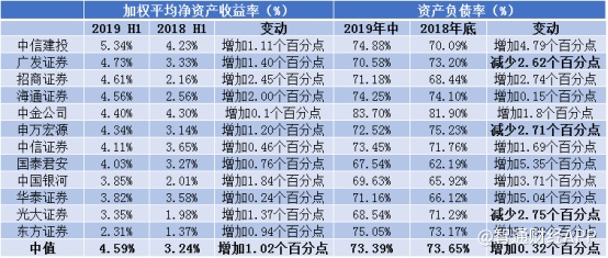 上半年,12家券商ROE水平均同比提升,资产负债水平整体向上。其中,招商证券、海通证券加权平均净资产收益率同比增加超2个百分点,广发证券、申万宏源、光大证券资产负债率则有所下降。纵观整体业绩,招商证券、海通证券为2019上半年增速最快的2家券商。