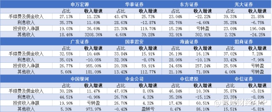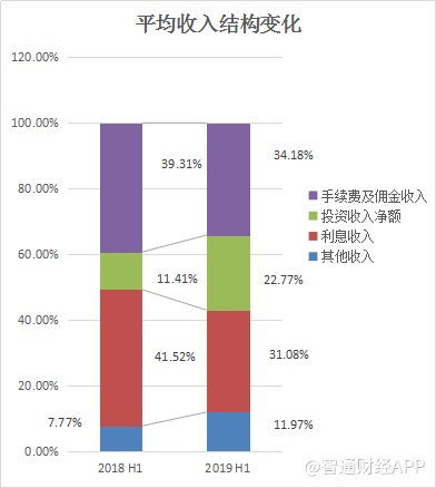 收入构成来看,投资为券商业绩增长的核心驱动因素,占比较去年同期扩大一倍至22.77%。相比之下,佣金收入及利息收入占比大幅缩水。其中,资本中介业务平均规模收缩,利息收入成为上半年承压最严重的板块,收入占比下滑约10%。