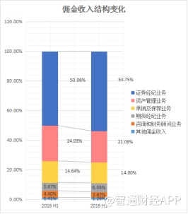 佣金收入结构方面,证券经纪业务、期货经纪业务为上半年增速最快的两项业务,同比分别上涨21.23%、24.60%,促进了整体经纪业务收入比重的进一步上涨至59.78%。相比之下,资管业务收入占比出现明显下滑,资管行业“去通道”“降杠杆”的趋势依旧延续。