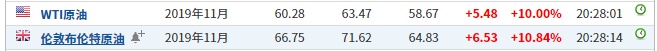 据悉,全球最大石油输出国沙特的两处石油设施9月14日遭到无人机袭击。沙特宣称这次袭击使该国石油产量减少一半,这意味着将影响近570万桶原油日产量,约占世界每日石油产量的5%,推动原油价格大幅上涨。截至发稿,WTI原油涨10%,报60.28美元/桶。布伦特原油涨10.84%,报66.75美元/桶。
