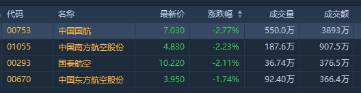 截至发稿,中国国航(00753)跌2.77%,报7.03港元;南方航空(01055)跌2.23%,报4.83港元;国泰航空(00293)跌2.11%,报10.22港元;东方航空(00670)跌1.99%,报3.94港元。