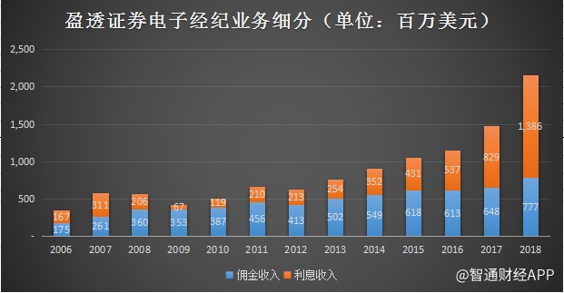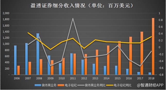 智通财经APP查看到其2018年的财报,电子经纪业务占了净收入96.8%,做市商业务则仅仅占3.2%。但是如果把时间往前推十年,当时的收入结构刚好相反。
