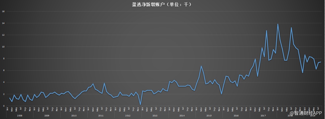 盈透证券的官网每个月都会公布新增账户数量,智通财经APP根据官网整理了盈透2008年到2019年二季度新增账户数据,如下: