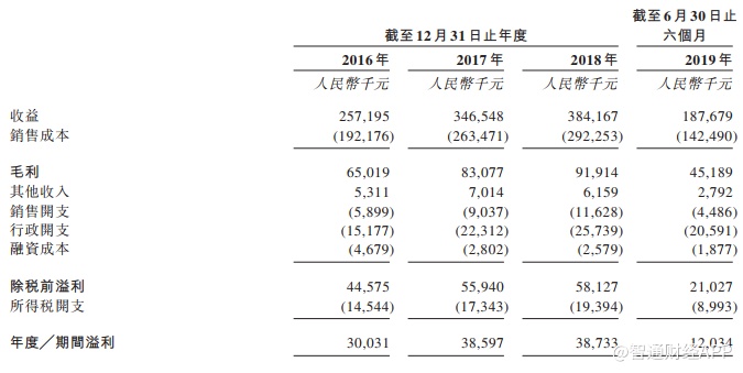 招股书显示,公司在2016年至2019年1-6月的总收益分别为2.57亿元、3.47亿元、3.84亿元、1.87亿元;毛利分别6501.9万元、8307.7万元、9191.4万元及4518.9亿元;期内溢利分别为3003.1万元、3859.7万元、3873.3万元、1203.4万元。整体而言,公司收益增速在逐步放缓。