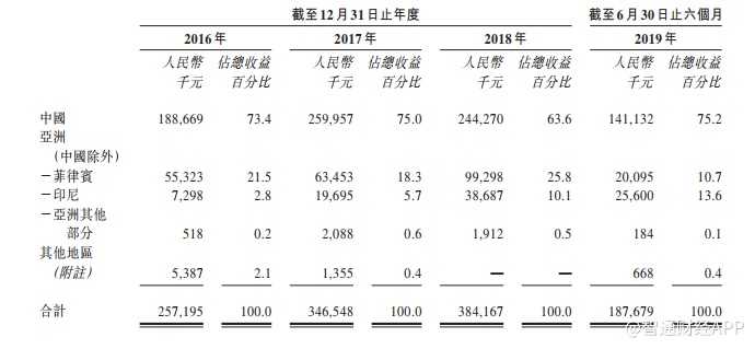 分地区来看,公司收益主要来自中国,小部分来自海外国家(如菲律宾及印尼)。2016年至2019年1-6月实现收益分别为1.89亿元、2.6亿元、2.44亿元、1.41亿元,占比总收益分别为73.4%、75.0%、63.6%、75.2%。值得注意的是,印尼地区的占比逐渐增大,从2016年的2.8%增长到2019年1-6月的13.6%。