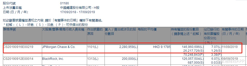 智通财经APP获悉,联交所最新资料显示,9月11日,摩根大通增持中国铁建(01186)288.1万股,每股作价9.1785港元,总金额约为2644.33万港元。增持后最新持股数目约为1.47亿股,最新持股比例为7.07%。