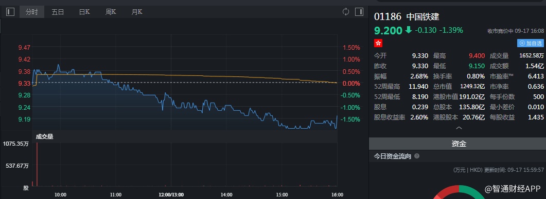 截至今日收盘,中国铁建(01186)跌1.39%,报9.20港元。