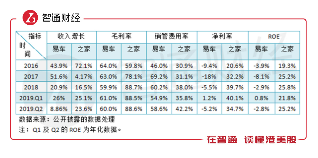 汽车之家和易车的收入均主要来源于广告收入,但汽车之家成长速度更快,毛利率更高,2019年Q2毛利率比易车高出28.6个百分点,按往年看均高出20个以上的百分点。在费用上,两家的核心费用均是销售及管理费,易车常年在50%以上,2019年Q2,易车的销售及管理费用率58.6%,比汽车之家高出了16.4个百分点。